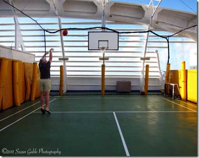 Here’s hubby taking a few shots at the basketball court. Notice the netting that surrounds the court. It is extremely windy up here. I think we were near Deck 17:
