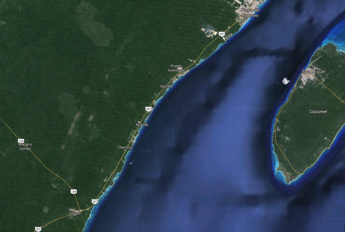 In the following map, we travelled south from Playa de Carmen (not on the map, but north of Puerto Aventuros) to Dos Ojos (just northwest of Tulum). The main road that we travelled on is Mex 307. Depending on what map I'm looking at, I can see 9-10 cenotes between Playa de Carmen and Tulum.